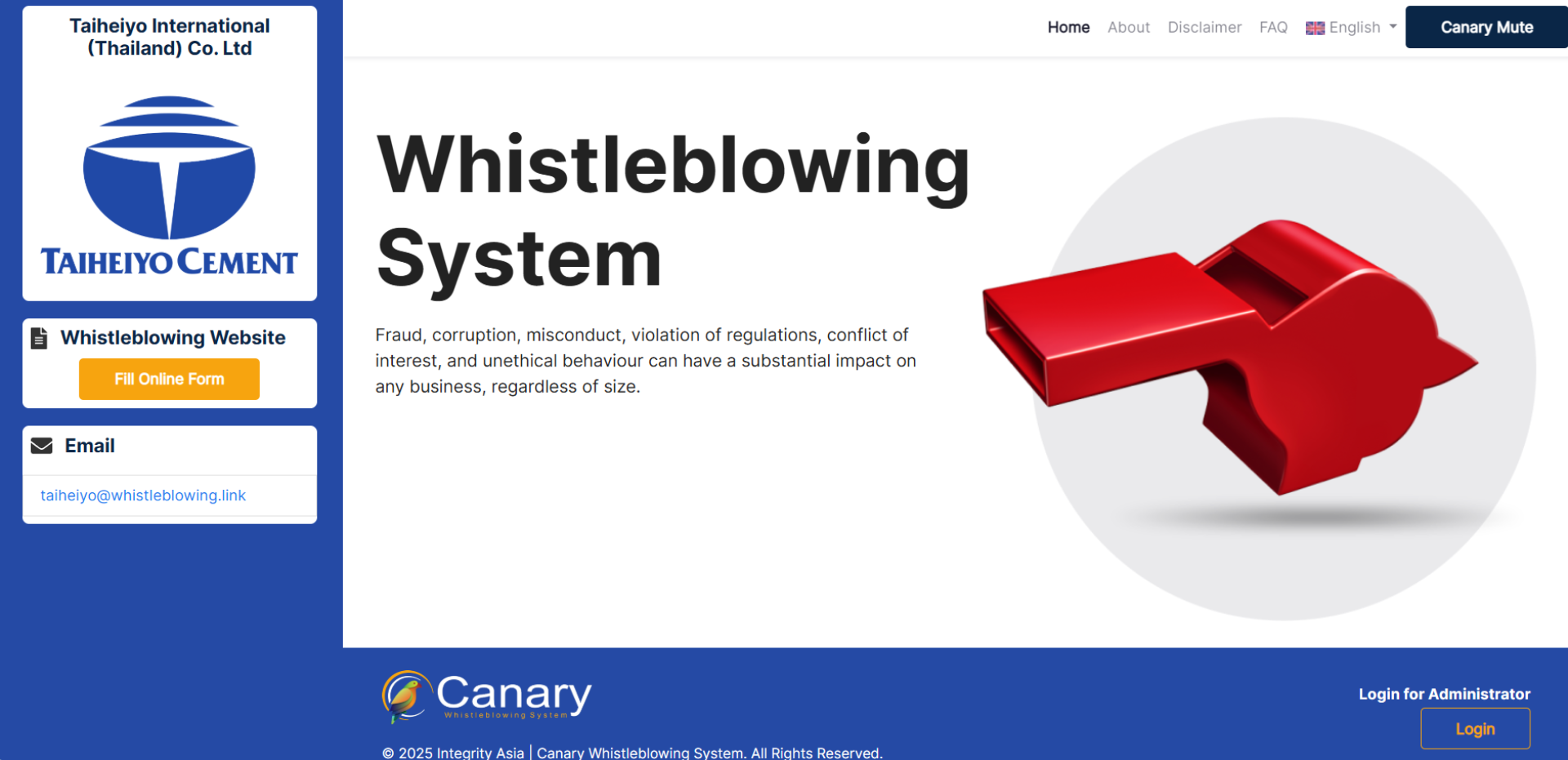 บริษัท ไทเฮโย อินเตอร์เนชั่นแนล (ประเทศไทย) จำกัด ยึดมั่นในมาตรฐานจริยธรรมขั้นสูงสุด บริษัทเปิดโอกาสให้พนักงานและผู้ที่เกี่ยวข้องในธุรกิจสามารถรายงานการกระทำที่อาจละเมิดกฎหมาย ข้อบังคับ และนโยบายของบริษัท หรือการทุจริต/คอร์รัปชัน ต่อคณะกรรมการได้โดยตรงผ่านช่องทางการรับแจ้งเบาะแส โดยใช้อีเมลและเว็บไซต์ด้านล่างนี้ ซึ่งเป็นผู้ให้บริการแจ้งเบาะแสอิสระจากภายนอก เพื่อให้มั่นใจว่ารายงานทั้งหมดของคุณจะถูกเก็บไว้เป็นความลับและปลอดภัยสำหรับการเปิดเผยโดยไม่ระบุตัวตน